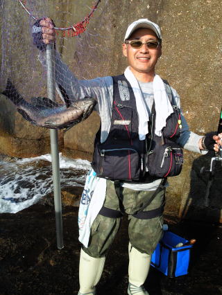 自分も『梶賀に来た限りは、狙いは50センチ級のオナガ』と思い、道糸ハリス3号(4号ハリスも持参)、グレ針9号の太いヤツで釣り始めてはいたものの、いきなり40オーバーのオナガを釣られると正直焦り、またやっかみもあって調子狂いました。(人間の器が小さい)