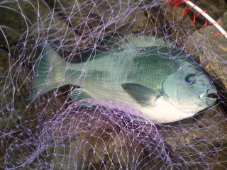 朝、釣り始めたらその人がなんと3投目でいきなり竿を曲げ、デカイのを上げました。『デカイなー』と言ったら、「そうでもないですよ」 やはり56センチ釣ってる余裕かなー。(渡船場に戻ってから測ったらちょうど50センチだった。うらやましいー)