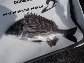 サシエを工夫しハリもいろいろ替えたりして努力。そんで秘密兵器?のヘラスレバリを登場させたら食い込みました。これも『どんなサイズかよーわからん』 糸を2回くらいやって釣りあげました。35センチのオレ好みのサイズ。これまでに何回も言ってますが自分はチヌの場合大きいのは嫌いなのであります。35〜40までの若くて元気で綺麗な女性?じゃなくて、チヌが好きなのであります。(写真は2匹目のです。きれいでしょう?)