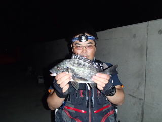 遊歩道の空いている場所で4時半前から夜8時半までやりました。昨日とはうって変わって海の様子は穏やか。絶好のファミリーフィッシング日和でした。小潮で釣り始めが下げ底。最初潮は全然動いてませんでした。なので軽い仕掛けで普通に釣り、15分ほどで30センチちょいのチヌがきました。『やっぱり明るいうちのほうがいいな〜』