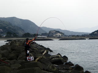 釣りはじめて20分くらいで永坂さんが掛けました。「全然引かん!」とか言ってたけど、竿はご覧の如くよく曲がっていました。前に出られないのでやり取りはちょっと難しい。4時ごろにも1つ追加して、45センチ級2つゲット。その後はひとつバラシて追加ならずでした。