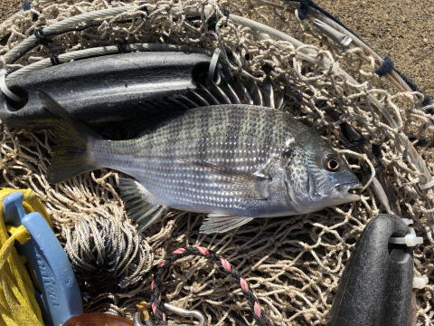 そういう中で9時半、私が20センチちょいチヌをゲット。 『やったー!』と言いながら写真撮ってからリリース。