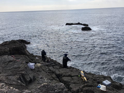 磯割はクドから赤島の東磯、自分は2人連れの年配の方と一緒にメキシコの手前の磯に降ろされました。2人に釣り座を選んでもらい、準備して7時過ぎに釣りはじめ。