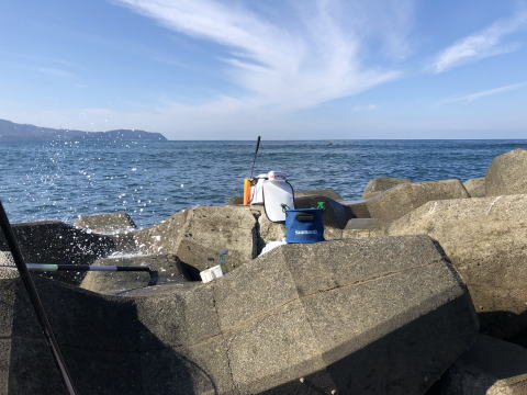 永坂さんから100メートルくらい離れた場所で3時に開始。永坂さんは棒ウキでやってましたが、私は大きめの円錐ウキを使いました。波が大きいので道糸が波に取られて釣り辛いので立ち位置や竿の持ち方、角度などを工夫。