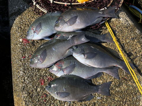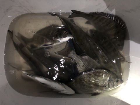 予想通り北陸サイズのグレまみれ。海況が変わってグレの活性が落ちた時がチヌのチャンスと思いつつ、我が家のおかずとご近所に配るぶんをある程度キープする目論見。